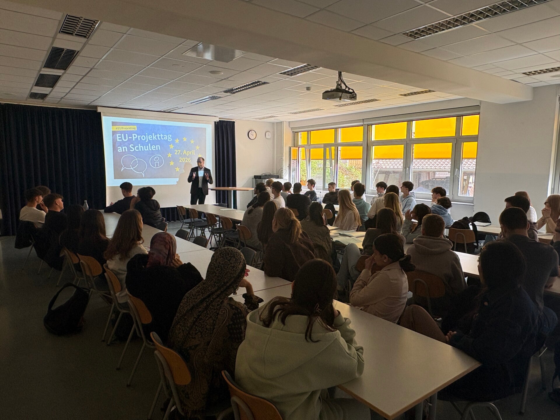 Am 27. April 2026 verwandelte sich der Theaterraum der Gutenbergschule Eltville in einen Ort des lebendigen politischen Dialogs. Im Rahmen des EU-Projekttages 2026 begrüßten die Klassen 10C und 10D den direkt gewählten Landtagsabgeordneten für den hiesigen Wahlkreis, Ingo Schon, zu einem intensiven Austausch über die Bedeutung Europas. Der Besuch bildete den passenden Abschluss der aktuellen Unterrichtseinheit zum Thema Europäische Union im Fach Politik und Wirtschaft.